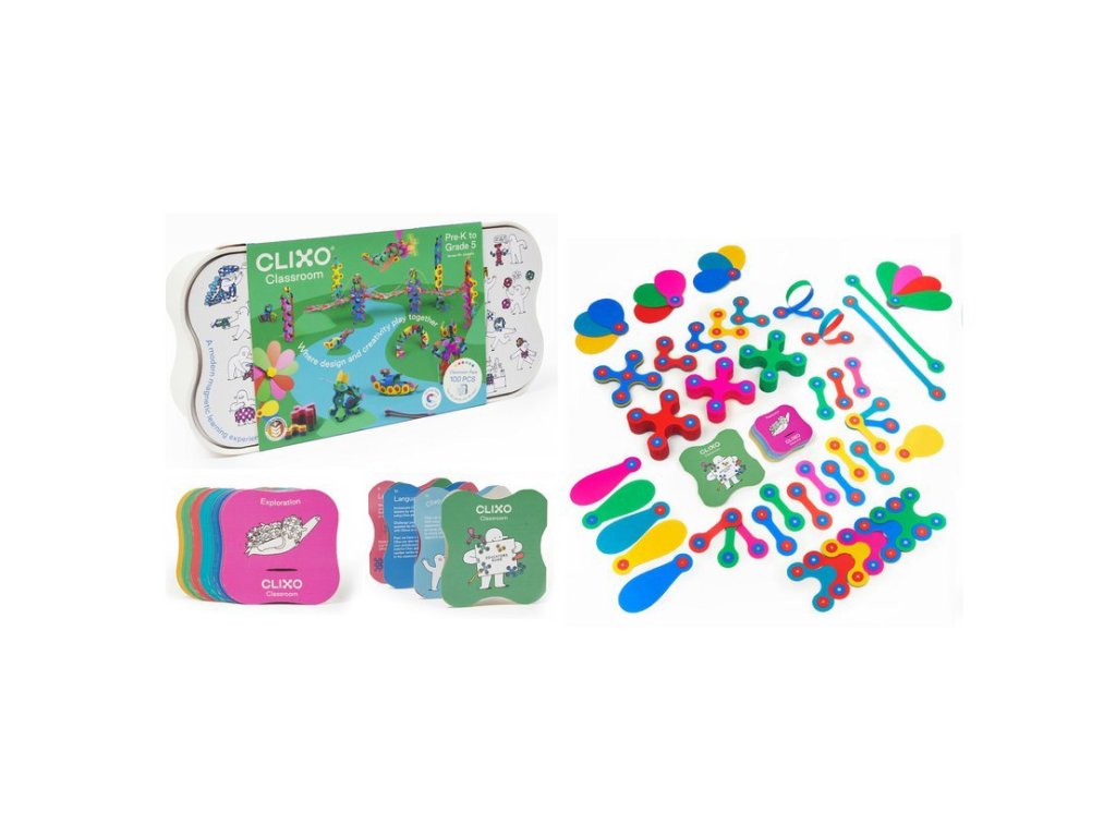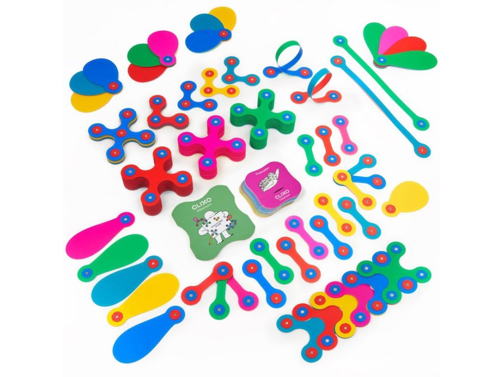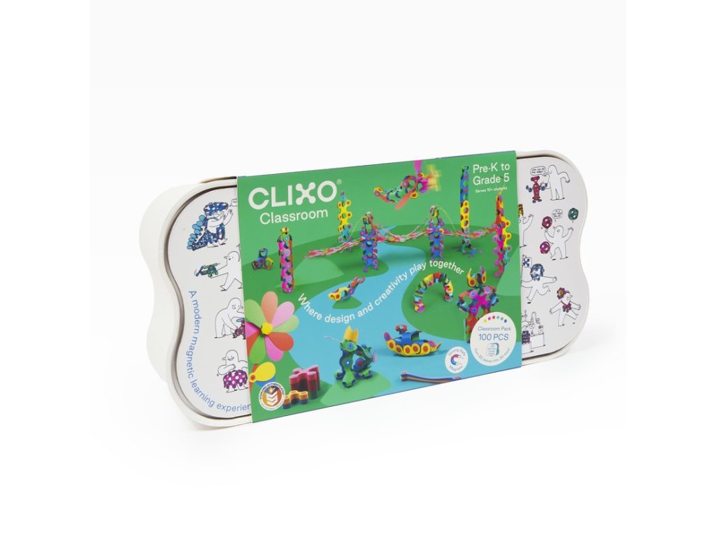 CLIXO Classroom - 100 kusů je flexibilní, velmi lehká, magnetická stavebnice v různobarevné kombinaci, která je inspirována origami a zároveň je to skvělá Montessori hračka. Tato stavebnice je založena na principu spojování různých tvarů a dílků přichycením červených a modrých magnetů k sobě. Sada Classroom je nejnovějším produktem Clixo obsahující také průvodce pro pedagogy a 30 karet s nápady na aktivity. Umožňuje vytvářet architektonické stavby, vědecké modely – např. molekuly, atomy nebo planetární soustavy. Umělecky zaměřeným dětem umožní vytvářet abstraktní obrazy, sochy a kreativní děti si mohou vytvářet své vlastní hračky nebo herní plochy pro stolní hry. Inspirace pro různé stavby naleznete na papírovém balení, jež tvoří obal výrobku. V tomto zázračném balení se skrývá svět zábavných objevů!