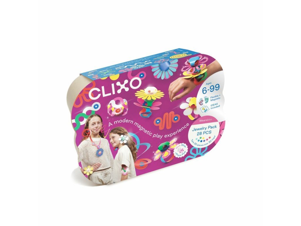 CLIXO Jewelry - 28 kusů je flexibilní, velmi lehká, tematicky laděná třpytivá magnetická stavebnice ze syntetického papíru, v barvách ideálních pro výrobku šperků. Je inspirována origami, ale je založena na principu spojování různých tvarů a dílků přichycením magnetů k sobě. Stavebnice Clixo je nejenom skvělá Montessori hračka, ale používá se i jako antistresová či relaxační pomůcka pro děti i dospělé. Tato tematicky laděná dívčí sada umožňuje díky svým třpytivým prvkům, ve kterých se láme světlo, vytvářet nepřehlédnutelné blyštivé šperky a módní doplňky jako např. prstýnky, náramky, náhrdelníky, které na světle září, až oči přecházejí, korunky pro princezny, různé ozdoby do vlasů či jiné módní doplňky. Sada obsahuje kromě základního tvaru také speciálně navržené květiny, které oživí jakékoli doplňky či šperky. Těchto 28 kusů v 10 veselých barvách s třpytivými prvky a unikátních CLIXO tvarech umožní stavění kreativních šperků či módních doplňků a dokáže zabavit malé slečny ale i velké parádnice. Výrobek je zpracován z kvalitního syntetického papíru, kterému neublíží ani voda. Jednoduché balení obsahuje i návrhy na stavění. Stavebnice je díky magnetům velmi dobře skladná a dá se snadno čistit. Sadu je možné rozšířit o CLIXO Tiny & Mighty Sparkle - 9 kusů a získat tak další třpytivé prvky.