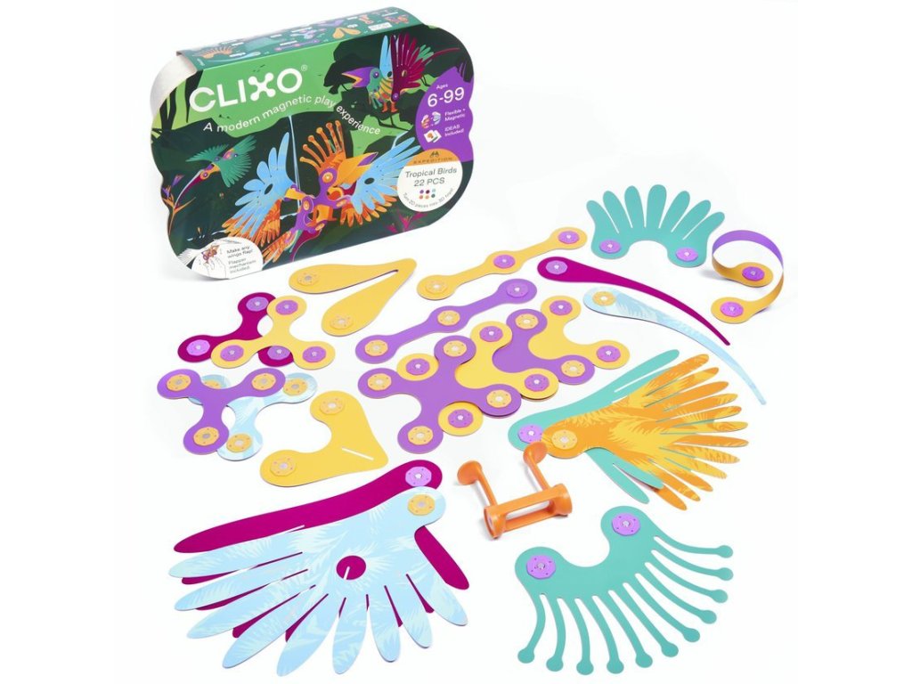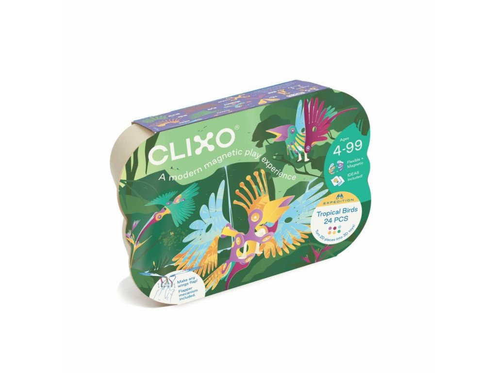 CLIXO Tropical Birds - 22 kusů je flexibilní, velmi lehká, graficky zpracovaná tematická magnetická stavebnice ze syntetického papíru, v hravých barvách v kombinaci s abstraktním potiskem, určená pro výrobu tropického či jiného ptactva. Je inspirována origami, ale je založena na principu spojování různých tvarů a dílků přichycením magnetů k sobě. Stavebnice Clixo je nejenom skvělá Montessori hračka, ale používá se i jako antistresová či relaxační pomůcka pro děti i dospělé. Tato opravdu unikátní tematická sada umožňuje vytvořeným ptákům doslova ožít a to díky inovativnímu mechanismu mávání křídel! Flexibilní magnetické díly vám umožní stavět živé tropické ptáky s křídly, kteří se pohybují. Vzlétněte pulzujícími deštnými pralesy a prohlédněte si, jak svět vypadá z výšky. Se speciálně navrženými křídly, peřím a zobáky přináší tato sada zázraky deštného pralesa na dosah ruky. Inspirace pro další stavby naleznete v přiložené brožuře či na papírovém balení, jež tvoří obal výrobku. V tomto tematickém balení se skrývá ptačí svět a svět zábavných objevů! Sadu je možné rozšířit o CLIXO Tiny & Mighty Jungle - 9 kusů a získat tak další prvky, které barevně a tematicky s touto sadou budou ladit.