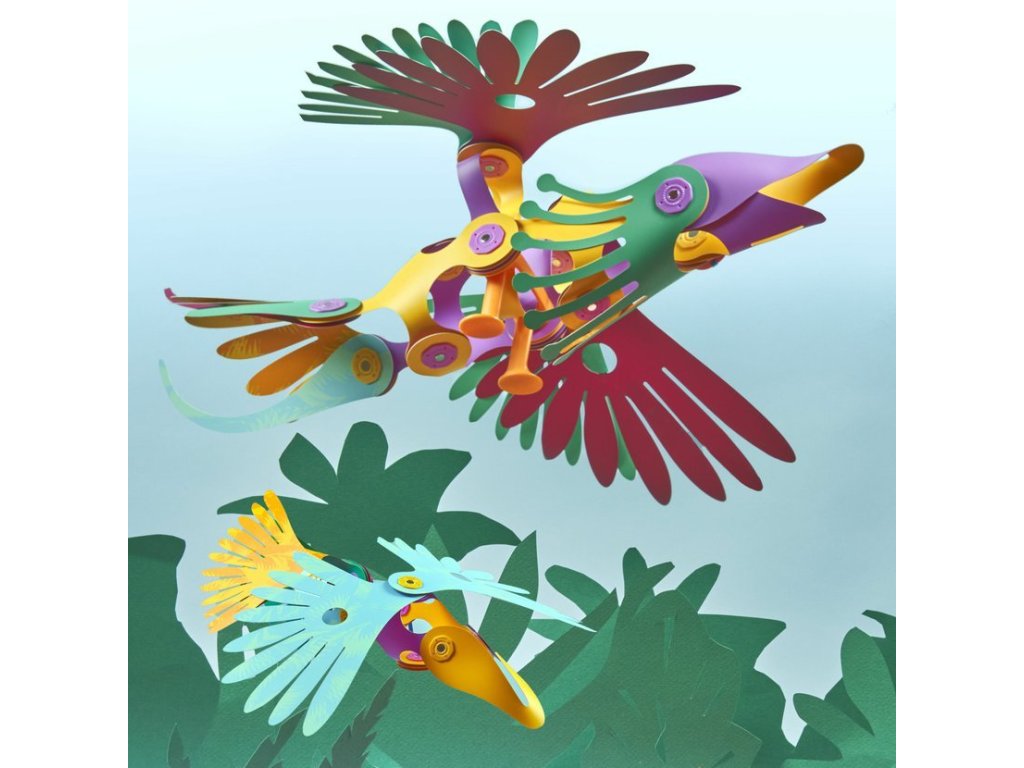 CLIXO Tropical Birds - 22 kusů je flexibilní, velmi lehká, graficky zpracovaná tematická magnetická stavebnice ze syntetického papíru, v hravých barvách v kombinaci s abstraktním potiskem, určená pro výrobu tropického či jiného ptactva. Je inspirována origami, ale je založena na principu spojování různých tvarů a dílků přichycením magnetů k sobě. Stavebnice Clixo je nejenom skvělá Montessori hračka, ale používá se i jako antistresová či relaxační pomůcka pro děti i dospělé. Tato opravdu unikátní tematická sada umožňuje vytvořeným ptákům doslova ožít a to díky inovativnímu mechanismu mávání křídel! Vzlétněte pulzujícími deštnými pralesy a prohlédněte si, jak svět vypadá z výšky. Se speciálně navrženými křídly, peřím a zobáky přináší tato sada zázraky deštného pralesa na dosah ruky. Inspirace pro další stavby naleznete v přiložené brožuře či na papírovém balení, jež tvoří obal výrobku. V tomto tematickém balení se skrývá ptačí svět a svět zábavných objevů! Těchto 22 kusů v 6 veselých barvách s grafickým potiskem a unikátních CLIXO tvarech umožní stavění nádherných exotických zvířat. Výrobek je zpracován z kvalitního syntetického papíru, kterému neublíží ani voda. Stavebnice je díky magnetům velmi dobře skladná a dá se snadno čistit. Sadu je možné rozšířit o CLIXO Tiny & Mighty Jungle - 9 kusů a získat tak další prvky, které barevně a tematicky s tou sadou budou ladit.