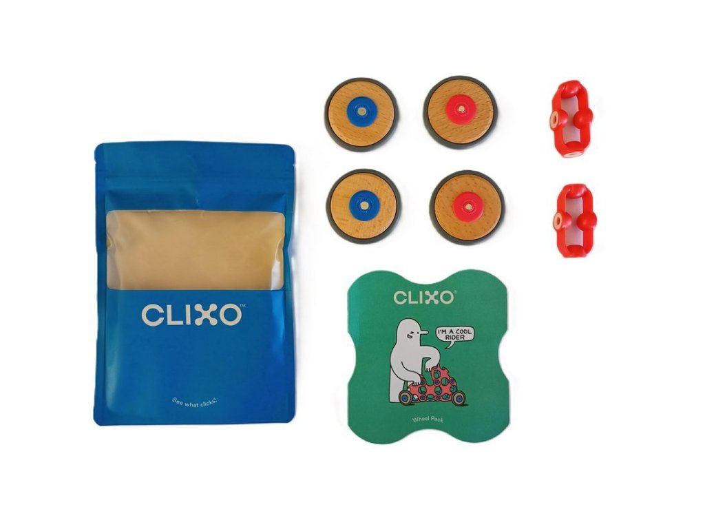 CLIXO Wheels - 4 kola a 2 spojky je doplňková sada kompatibilní se všemi sadami. Spojky umožňují dvojí uchycení kol a to jak na delší, tak kratší straně. Díky kolečkům se jednotlivé výtvory dětí doslova dostanou do pohybu a ožijí. Toto balení je tedy vhodné jako doplněk ke všem sadám. Inspirace pro různé stavby naleznete uvnitř papírového balení. Výrobku neublíží ani voda a proto se dá snadno čistit.