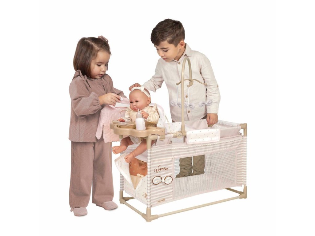 DeCuevas 53178 Moje první postýlka pro panenky s hracím centrem Verona 2025 ze stejnojmenné, velmi úspěšné kolekce z roku 2024 je u holčiček oblíbená díky svému rozmanitému příslušenství a úložnému prostoru, který ocení i pořádkumilovné maminky. Kolekce nabízí nejen zmíněné kočárky, ale i jiné doplňky pro malé slečny a jejich panenky. Decentně laděná kolekce Verona se celá nese v jemných pastelových přírodních barvách i vzorech. Kombinace světle béžové a bílé s roztomilými puntíky nebo proužky doplňuje světle hnědé úzké lemování, které zdůrazňuje dokonalost tvarů a krásně ladí s hnědými madly kočárků. Přírodní styl kolekce podtrhují aplikace mašliček zobrazující okvětní lístky a drobné výšivky včeliček. Nádherný španělský design, precizní zpracování. Velmi snadná manipulace během samotné hry. Materiál: kov, plast, textil. Baleno v krabici v barvách kolekce. Doporučený věk od 3 let.