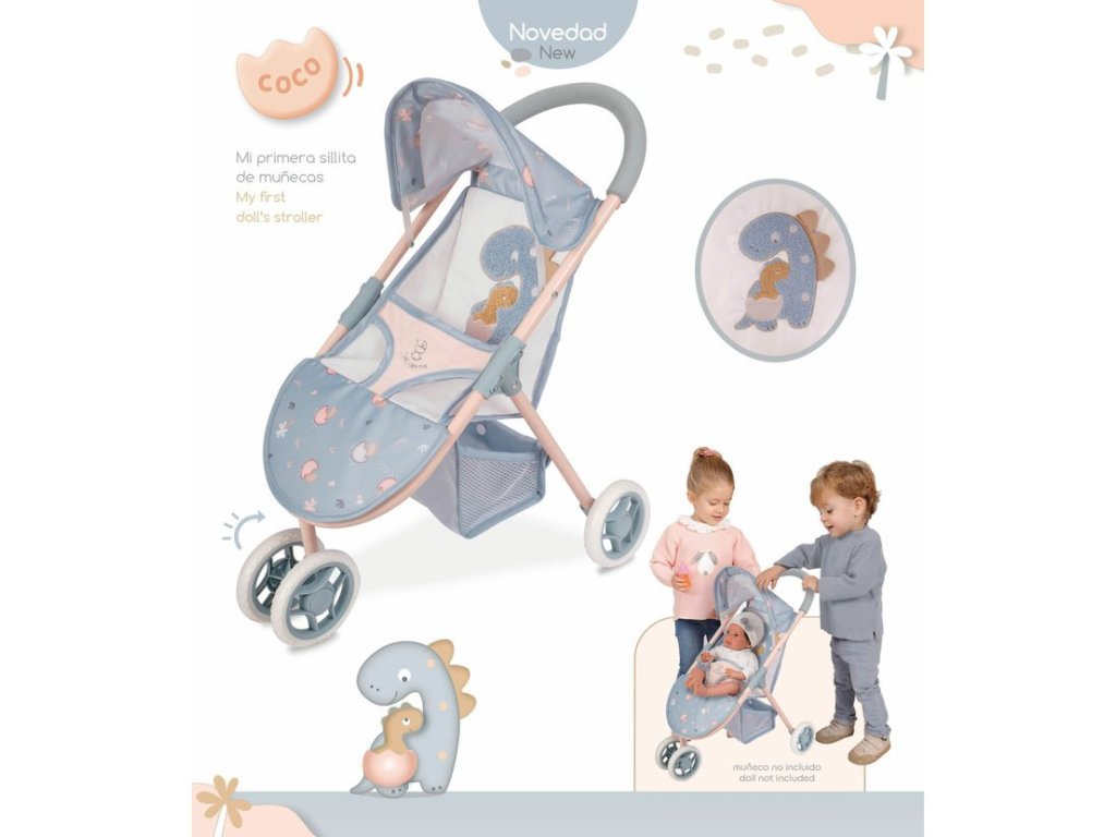 DeCuevas 90080 Skládací kočárek pro panenky golfové hole COCO 2024 - 56 cm patří do stejnojmenné kolekce, která je novinkou roku 2024 a nabízí nejen kočárky, ale i jiné doplňky nejen pro malé slečny a jejich panenky, ale také chlapce. V hravé kolekci COCO je dominantní obrázek dinosauří maminky se svým roztomilým mláďátkem, které nese na zadečku ještě vaječnou skořápku. Potisk malého dinosauříka na jemně holubičí šedomodré látce je základem celé kolekce, již zdobí prvky v pískové nebo narůžovělé barvě, která se promítá i do většiny nosných konstrukcí.