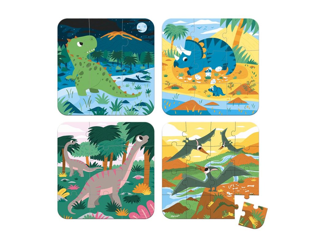 S těmito 4 rostoucími puzzle s tématikou dinosaurů mohou děti ve věku od 2 a více let prozkoumat období Jury.