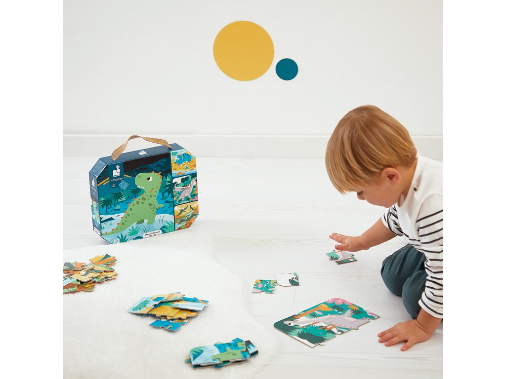 Puzzle, které rostou s děťátkem. Produkt obsahuje 4 různé balíčky puzzle se 6, 9, 12 a 16 ks s motivem Dinosauři. Dítě začíná skládat obrázek s nejmenším množstvím dílků a postupně jak se ve skládání puzzle zdokonaluje, může přejít na puzzle s vyšším počtem dílků. Puzzle jsou baleny v originálním a praktickém kufříku se zavíráním, takže jsou vždy uklizené a zároveň jsou pěkným doplňkem do dětských pokojíčků. Součástí balení je i plakát, který lze použít jako šablóna. Puzzle rozvíjejí logické myšlení, pozornost, paměť, představivost, jemnou motoriku, a zároveň se děti učí vnímat vztah mezi částmi a docela.