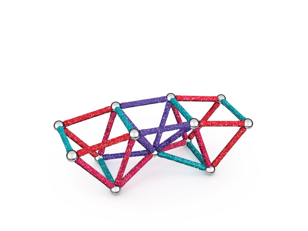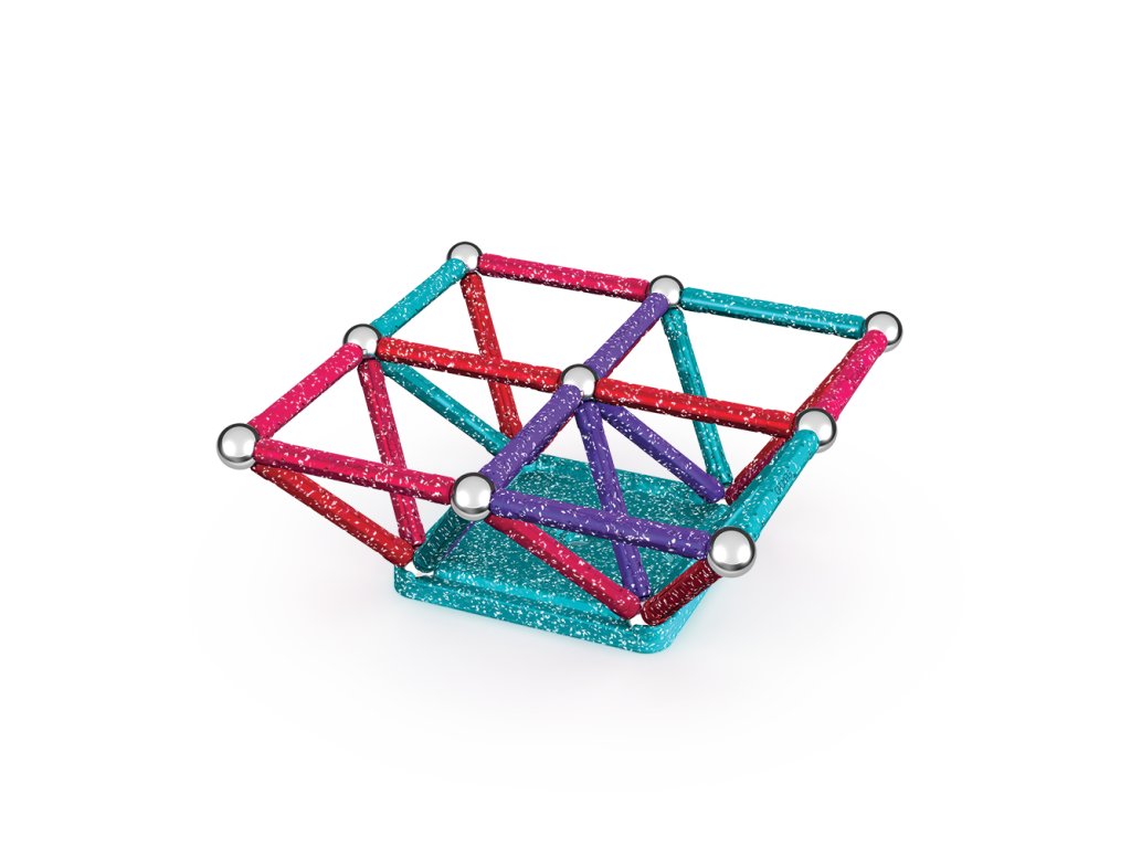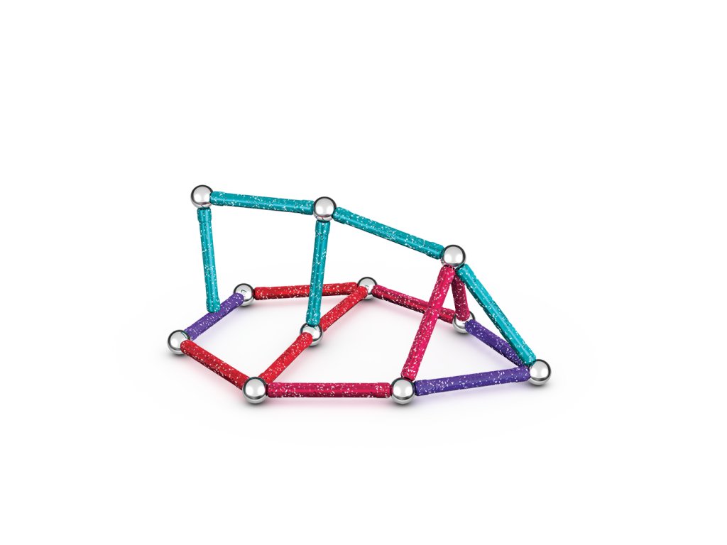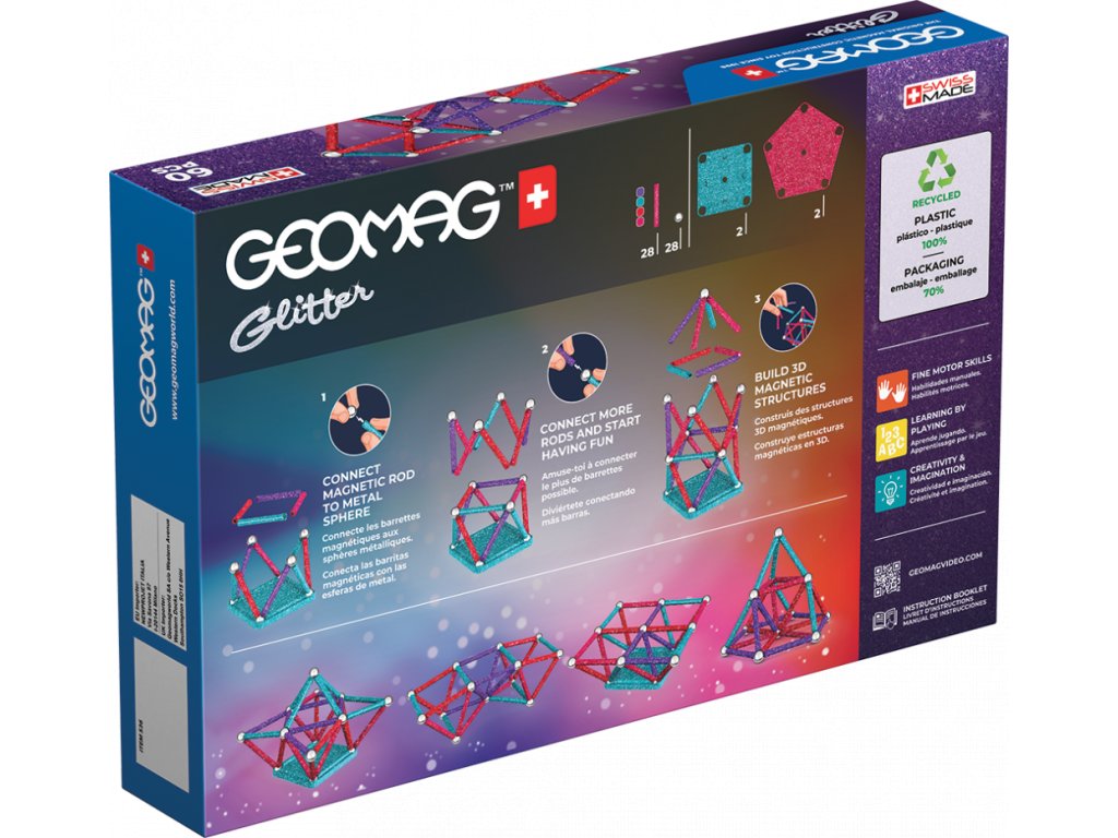 Super stylová řada Glitter, věnovaná fanouškům zářivých barev, je nyní také ze 100% recyklovaného plastu. Třpytky obsahuje i úložná plastová krabička, kterou můžeš mít stále u sebe a budou ji chtít i všichni kamarádi. Stavebnice obsahuje celkem 60 dílků - 28 barevných magnetických tyček, 28 ocelových kuliček, 2 modré čtvercové podstavce a 2 pětiúhelníkové červené podstavce. Kromě kuliček obsahují všechny součástky, včetně plastového pouzdra, třpytky. Stavebnice je určena pro děti od 3 let a je ze 100% recyklovaného plastu.