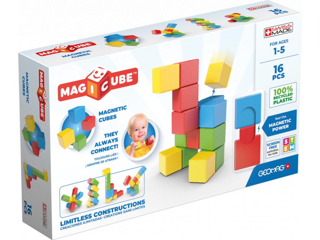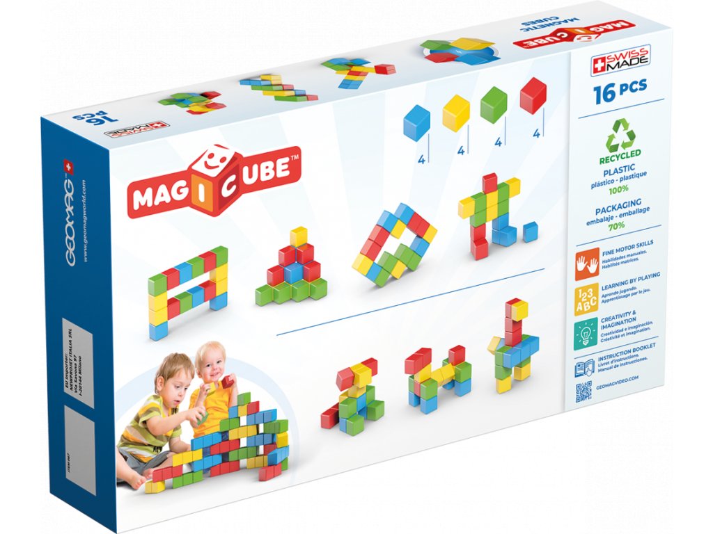 Stavebnice Magicube Try Me 16 pcs vám nabízí možnost vyzkoušet magnetismus v praxi a zve vás do světa staveb vytvořených z našich magnetických kostek Geomag. Ty jsou vyrobeny ze 100% recyklovaného plastu, s respektem k naší planetě a životnímu prostředí. Stavební systém této inovativní hračky je tvořený magnetickými kostkami, které se k sobě navzájem přitahují ze všech šesti stran. Využitím neviditelných sil magnetismu mohou děti popustit uzdu své fantazie při vytváření barevných 3D modelů. Hrou s magnetickými kostkami si i ty nejmenší děti začnou rozvíjet své první manuální dovednosti, stavět věže i učit se barvy. Obsahuje 16 magnetických kostek ve čtyřech barvách. Vhodné pro děti již od 1 roku.
