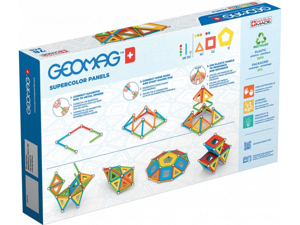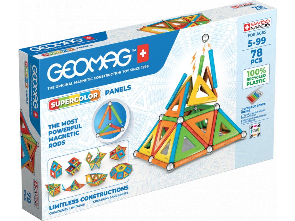 Všechny plasty použité pro potahy tyček a panelů jsou ze 100% recyklovaného materiálu a jejich dokonalé barvy potěší i ty nejnáročnější. Součástí balení jsou navíc praktické transparentní úložné boxy, které jsou také vyrobeny z recyklovaného plastu. S nimi máte možnost mít stavebnici pořád u sebe a navíc přehledně srovnanou v kapesním balení. Obsah balení: 20 x ocelová kulička potažená bílým bronzem, 2 x výplň - pětiúhelník, 12 x výplň - čtverec, 16 x výplň - trojúhelník, 28 x magnetická tyčinka 5,7 cm.