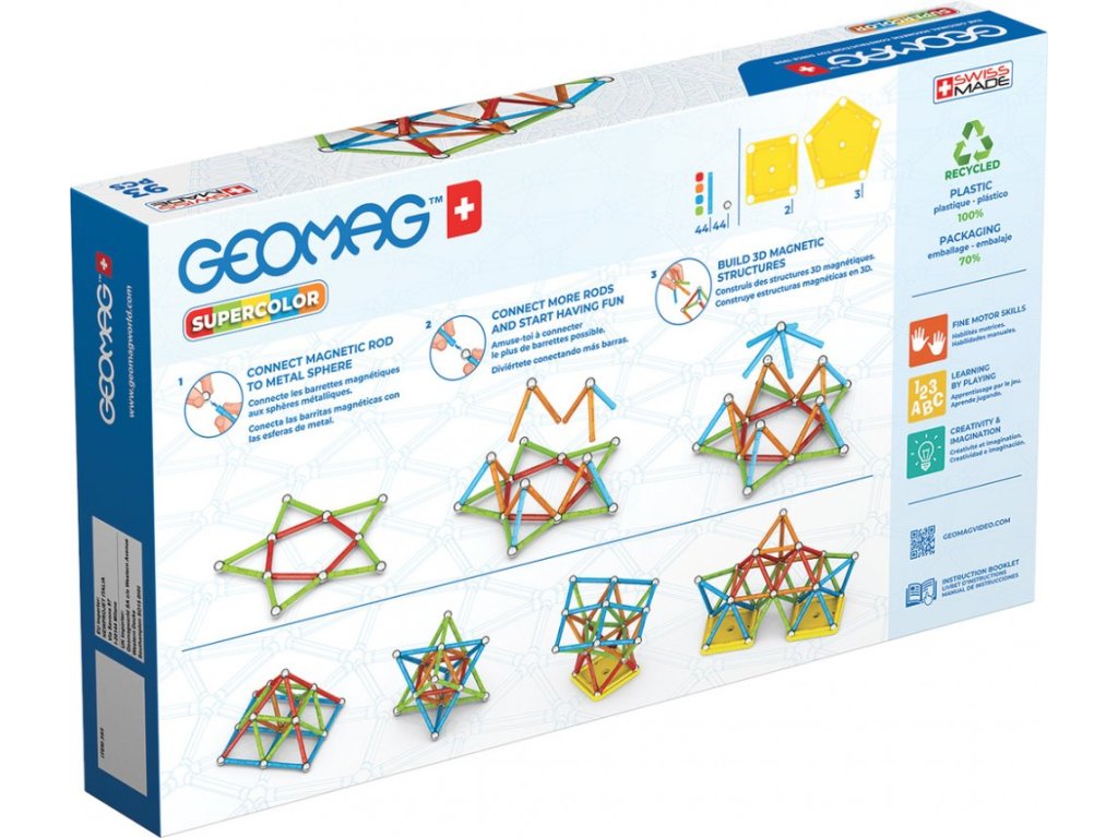Řada Supercolor je tvořena jedinečnou kombinací pastelových barev tyček i výplní. Všechny plastové části jsou vyrobeny ze 100% recyklovaného materiálu. Stavebnice obsahuje 93 dílků a součástí balení jsou navíc praktické transparentní úložné boxy, které jsou také vyrobeny z recyklovaného plastu. S nimi máte možnost mít stavebnici pořád u sebe a navíc přehledně srovnanou v kapesním balení. Obsah balení: 44 x ocelová kulička potažená bílým bronzem, 2 x podstavec - pětiúhelník, 2 x podstavec - čtverec, 44 x magnetická tyčinka 5,7 cm Geomag myslí nejen na budoucnost našich dětí, ale i na budoucnost naší planety.