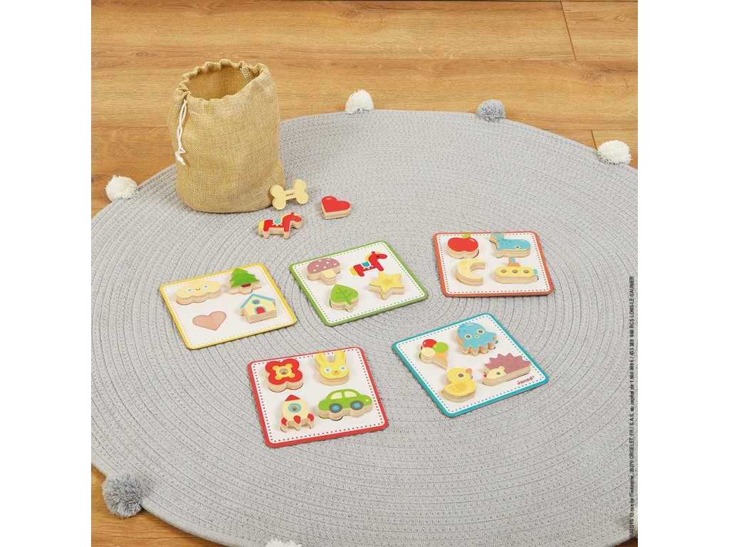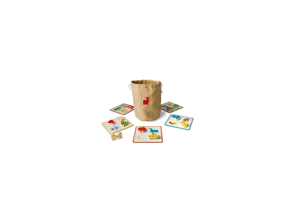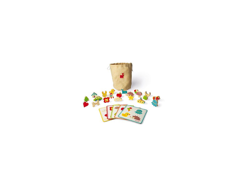 S tímto dřevěným pexesem se zabaví všechny děti, samy, ale také společně. Malé dětičky si mohou karty s obrázky položit před sebe a ze tvarů vybrat a správně přiřadit – tvar položit na správné místo na kartičce. Ale jinak je dřevěné pexeso určeno pro dva až pět hráčů. Hráči si rozdají náhodně kartičky, které si položí každý před sebe. V tašce jsou uloženy dřevěné tvary. Celkem jich je 21. Hráči si po jednom náhodně vybírají z tašky předměty a mají-li ho na kartičce, přiloží jej na správné místo na ní. Vyhrává hráč, který zaplní svou kartičku nejrychleji. ALE POZOR!