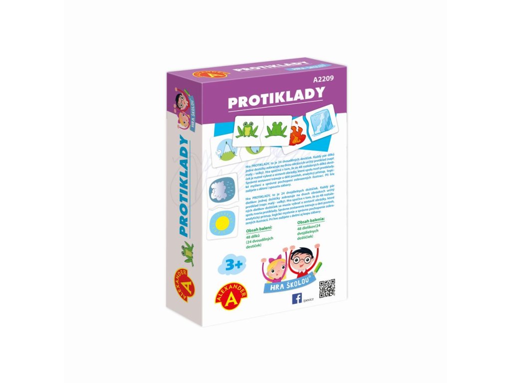 Naučné hraní pro malé zvědavce. Krabička "HRA ŠKOLOU® – PROTIKLADY pro děti již od 3 let do 6 let. Pomocí dvoudílných velkých kartiček s obrázky se děti učí chápat protiklady (např. malý – velký, den – noc, vysoký hluboký atd) Tvar spojení jim napoví, jestli opravdu našli správnou dvojici. Série Hra školou® byla oceněná 3. místem HRAČKA ROKU 2018. Téměř každé dítě má rádo krásné obrázky a proto je učení snadné a zábavné. Holčičky a kluci, budou hledat a spojovat dva dílky patřící k sobě do jedné destičky. Všechny dílky rozloží a promíchají. Potom hledají správnou dvojici. Pozorujte, hledejte a kombinujte. Podaří se nakonec najít a opět dát dohromadyvšechny protiklady? Díky této hře se děti učí poznávat nová slova, zlepšují si postřeh a také logické uvažovaní. Pokud si děti nebudou jistí, jestli k sobě daná dvojice patří, poznají to hned po přiložení obou polovin destičky k sobě, podle tvaru vlnky, která do sebe perfektně zapadne. BENEFITY: - pomáhá s rozvojem vyjadřování a obohacuje dětský slovník - přirozeně rozvíjí pozorovací a kombinační schopnosti - pomáhá zlepšovat jemnou motoriku Hra je vhodná pro děti od 3 do 5 let. Hra je ze série naučných her pro malé objevile "HRA ŠKOLOU®", která byla oceněná jako "Hračka roku 2018". Obsah balení: 48 dvoudílných destiček s obrázky z pevného kartonu, český a slovenský návod ke hře
