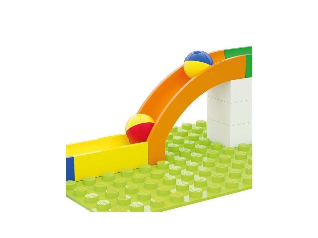 Skluzavka zpomaluje rychlost kuličky při kutálení směrem dolů, ale díky speciálnímu tvaru se kulička otáčí mnohem rychleji kolem vlastní osy. Tento vizuální efekt je dobře patrný na dvoubarevných kuličkách, které naleznete v balení. Balení obsahuje: 4 skluzavky a 8 dvoubarevných kuliček.