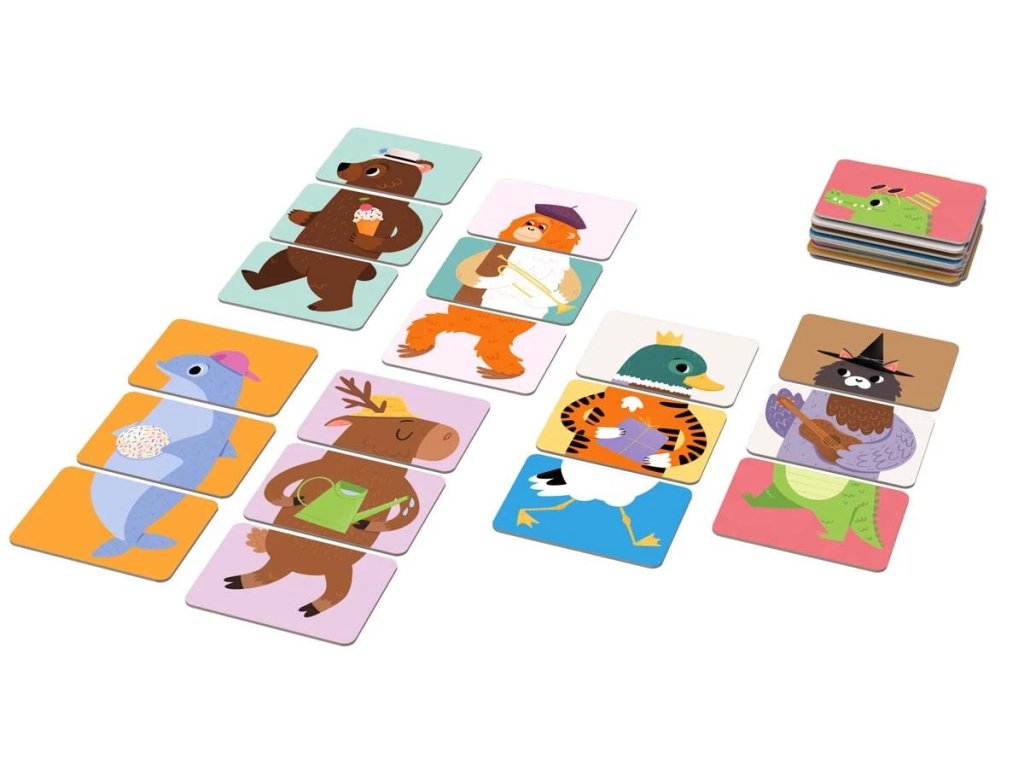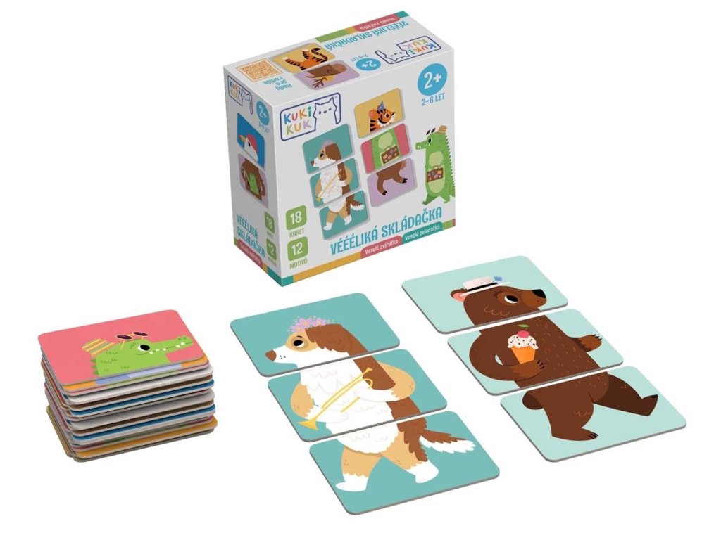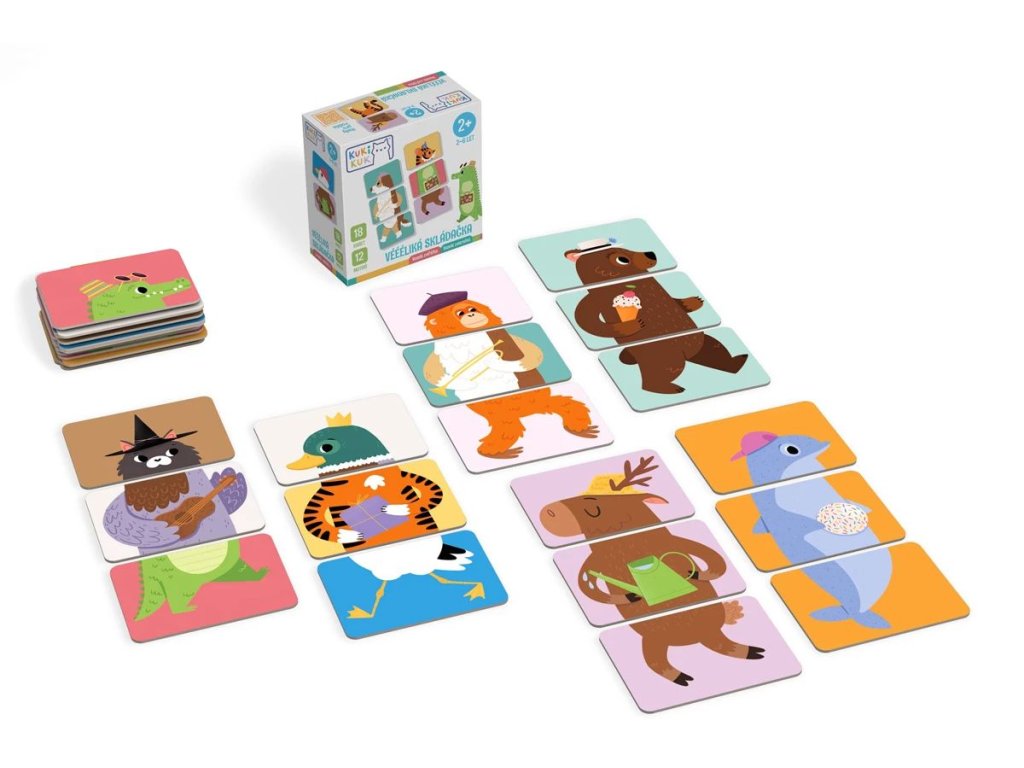 Kreativní hry pro děti s veselými motivy zvířátek. Obsahuje 18 karet z 2 mm silného kartonu s 12 druhy zvířátek, ze kterých je možno vytvořit mnoho legračních kombinací. Pro děti od 2 let. Obsahuje tipy na různé herní varianty. Vyrobeno v ČR.