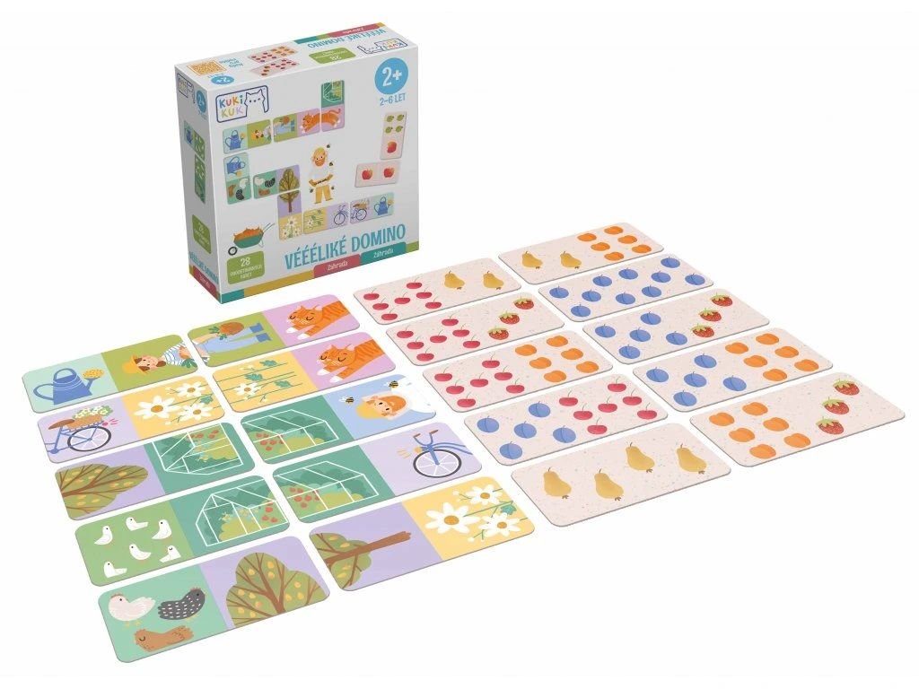 Domino Zahrada obsahuje 28 oboustranných hracích karet. Před započetím hry si nachystejte vždy všech 28 kartiček v jedné verzi, tzn. otočte si všechny kartičky nahoru buď s obrázky, anebo s puntíky, které jsou znázorněny různými druhy ovoce.