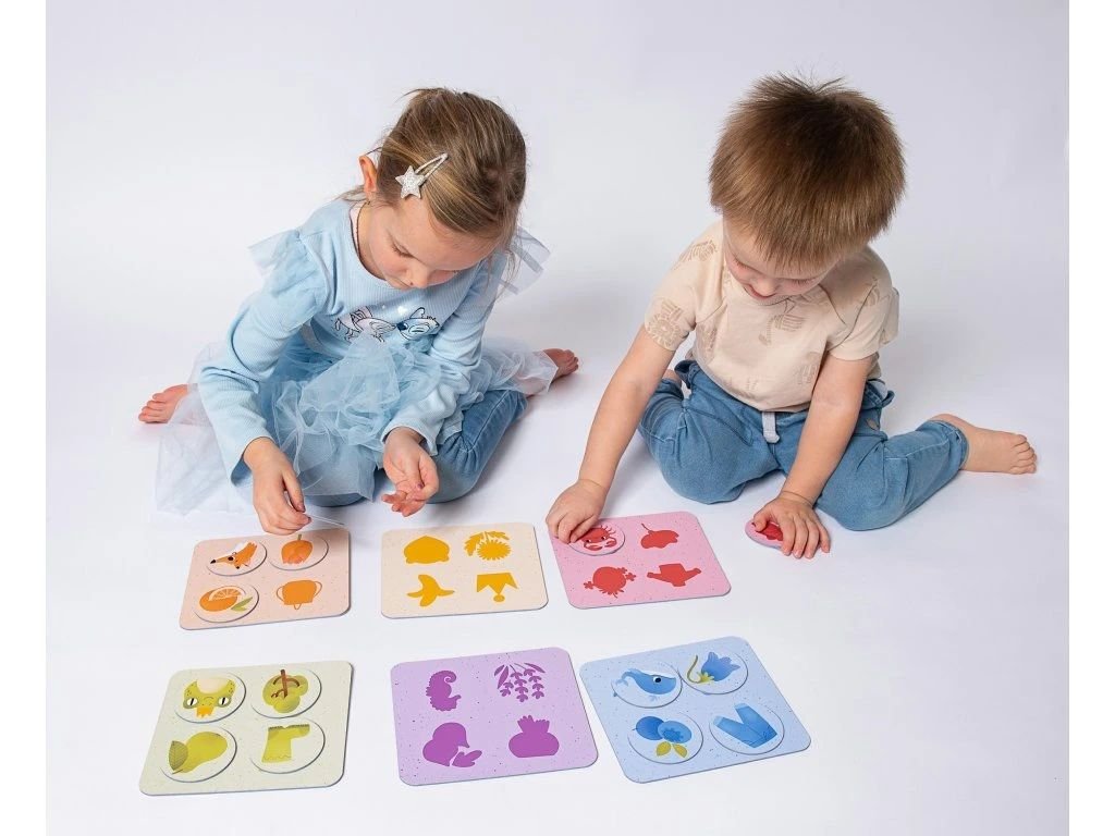 Položte vybranou desku a odpovídající žetony před dítě. Dítě má za úkol umísťovat žetony na správná místa podle barev a příslušných stínů – obrysů. Přidejte na plochu víc žetonů. Požádejte své dítě, aby přikládalo žetony na správná místa na hracích deskách. Cílem je vyskládat všechny žetony na hrací desky a docílit, aby dítě správně položilo všechny žetony.