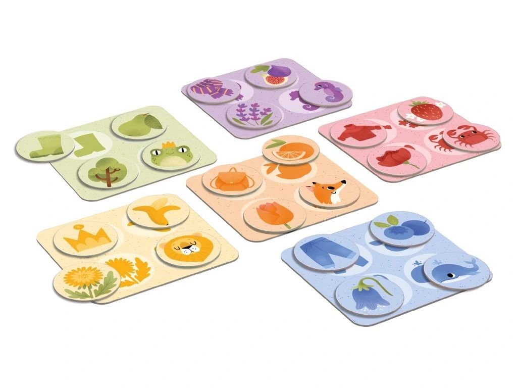 Přikládejte k desce příslušné žetony. Vysvětlete dítěti souvislost obrázku na žetonu a jeho stínem na hrací desce. Pojmenujte základní barvu desky a jejich obrázků. Požadujte po dítěti, aby popsalo pojmenovaný obrázek: zvířátko – kde žije, květina – kde roste, ovoce – jak chutná, oblečení – kdy se používá, z jakého je materiálu. Zkuste vyjmenovat další věci nebo rostliny a zvířátka, která mají stejnou barvu a mohly být na stejné hrací desce.