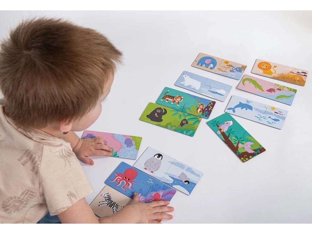 Puzzle DUO je vytvořeno tak, že linie spojovacích částí má takový tvar, aby šly spojit pouze správné obrázky, které patří k sobě. Zobrazují 12 různých zvířat v jejich přirozeném prostředí.