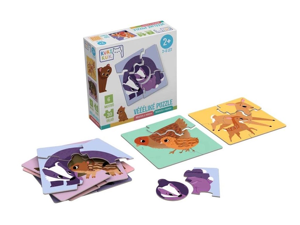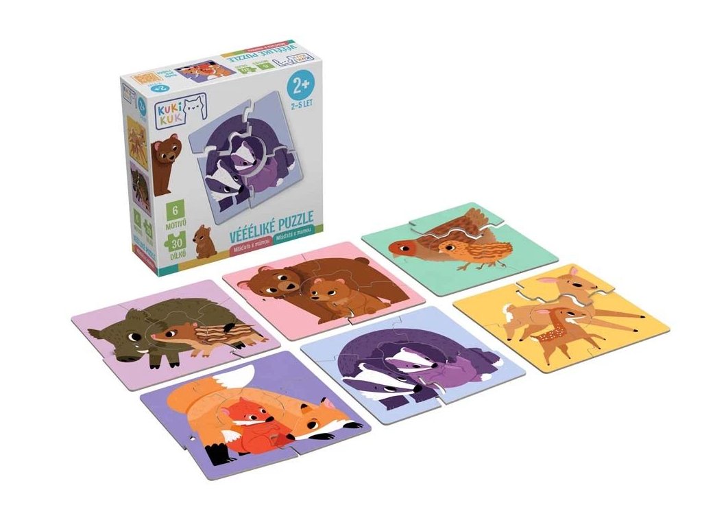 Originální puzzle s šesti motivy mláďat se svou mámou. Velké pevné dílky jsou ideální pro malé ručičky batolat. Obsahuje také tipy pro rodiče na další využití puzzlí. Vyrobeno v ČR.