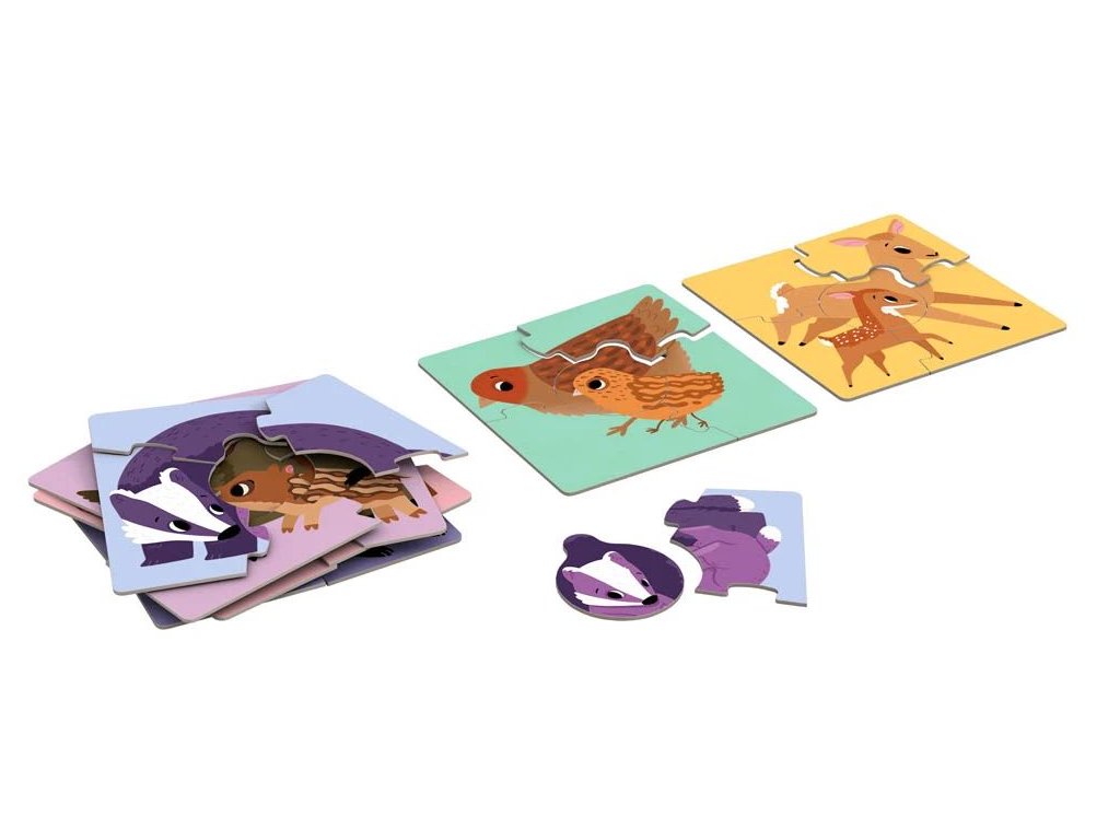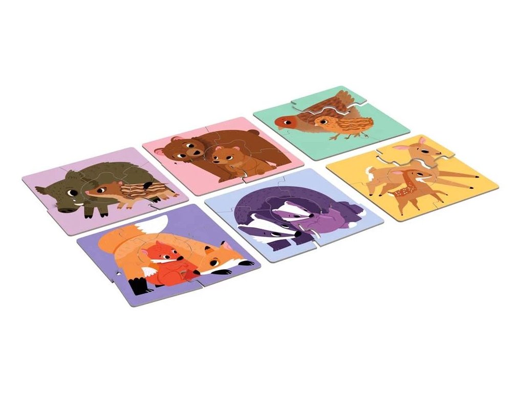 Představujeme vám originální puzzle, které zachycují momenty mezi mámou a jejím mládětem. Velké a pevné dílky jsou ideální pro malé ručičky. Na jednotlivých puzzle o velikosti 15,5 x 15,5 cm po sestavení vyniknou kouzelné ilustrace šesti rodinek. Puzzle je vytvořeno tak, že linie spojovacích částí (spojovací zámky) mají sice stejný tvar, ale pouze složením čtyř velkých dílků do výsledného čtverce vznikne správný obrázek. To platí o hlavních dílcích, které zobrazují dospělého jedince. Mláďátka – prostřední dílek – mají stejný tvar u všech motivů.