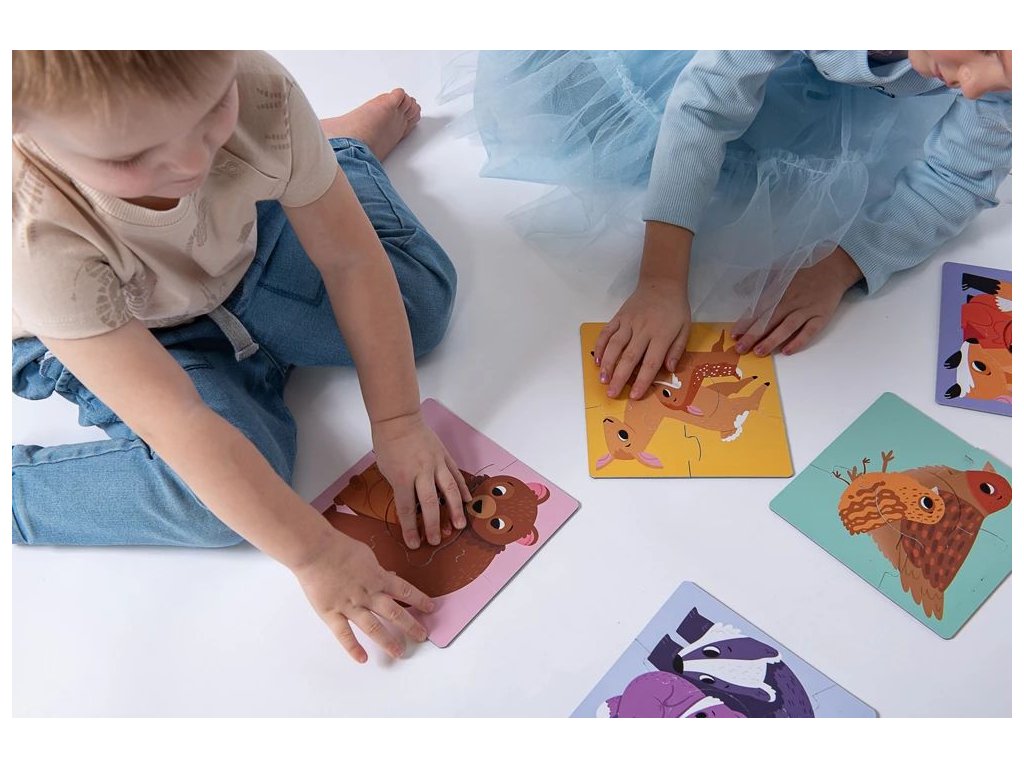 Najděte dílky jednoho motivu. Před dítě položte různě pomíchané dílky již lícovou stranou nahoru a nechte dítě, aby obrázek správně složilo. Přidávejte další dílky, postupně navyšujte počet motivů, které má za úkol dítě poskládat. Učte je správně pojmenovat: prase divoké, srnka, medvěd, liška, jezevec a ptáček.