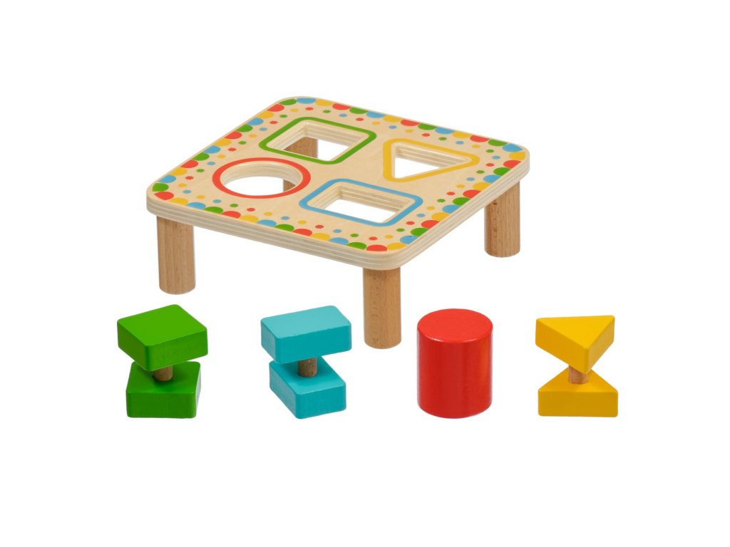 Třídění geometrických tvarů není jen běžná dřevěná vkládačka, která učí děti poznávat základní geometrické tvary a barvy. Hra má totiž tři důmyslné dvoudílné vkládací prvky. Dítě tedy bude muset nejprve tyto prvky roztřídit a přiřadit k odpovídajícím otvorům a následně najít způsob, jak je skrz vybrané otvory prostrčit. Dvoudílné prvky je totiž třeba při průchodu deskou po prvním vsunutí správně pootočit, aby prošel skrz otvor celý vkládací prvek. Tato činnost bude vyžadovat u dětí více logického myšlení a kombinace těchto úkolů je pro děti větší výzvou a je skvělá na podporu motorické zručnosti a trpělivosti. Hra obsahuje dřevěnou desku na nožičkách se 4 barevně orámovanými otvory, 3 dvoudílné vkládací prvky se základními geometrickými tvary a jeden válec. Prvky jsou ve 4 barvách, které korespondují s rámečky na vkládací desce. Rozměry desky: délka 16 cm, šířka 16 cm, výška 6 cm. Rozměry tvarů cca 4,5 cm x 4 cm.