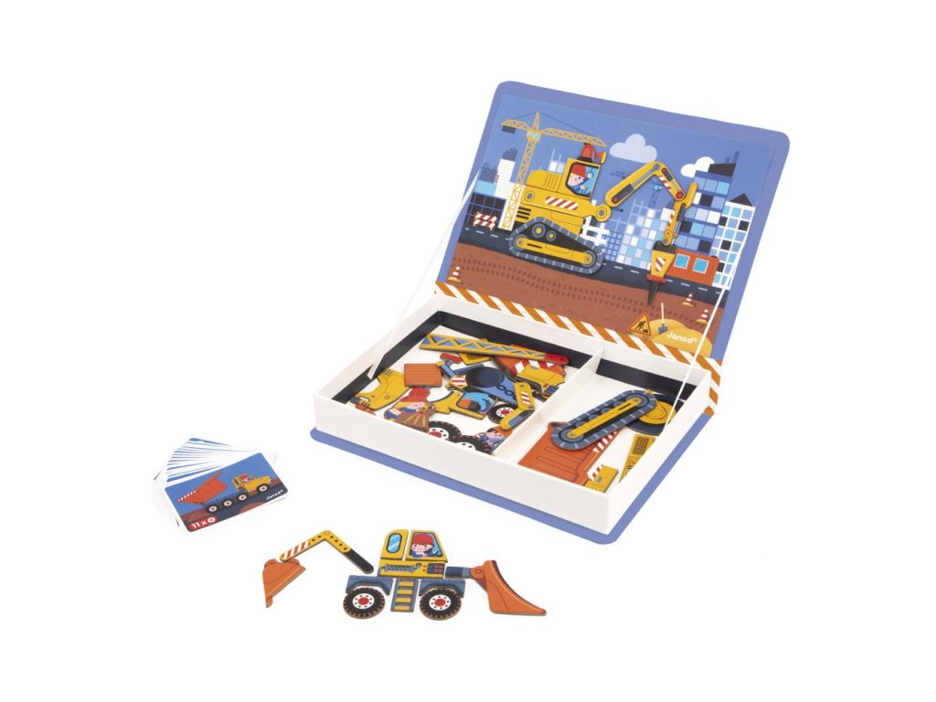 Magnetická kniha Na stavbě pro děti od 3 let, obsahuje 19 předloh a 50 ks magnetických dílků.