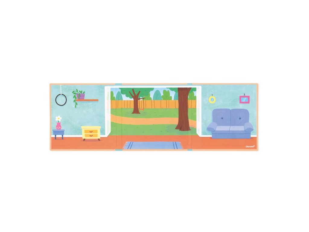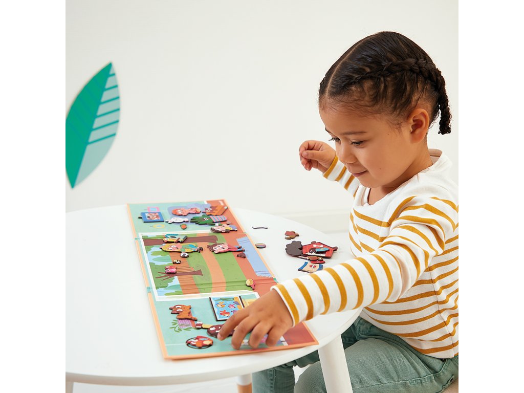 Jednoduchá otevírací magnetická kniha, kde si dieta umisťuje přiložené magnetky podle vlastní fantazie a vytváří si z magnetek vlastní příběh.