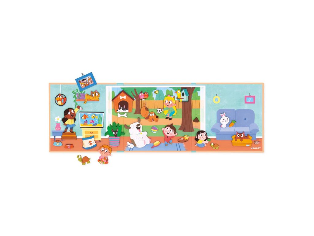 Rozkládací magnetická kniha Domácí mazlíčci pro děti od 3 let je vhodná pro cestování plné dobrodružných zážitků a příběhů, obsahuje 30 magnetických částí.