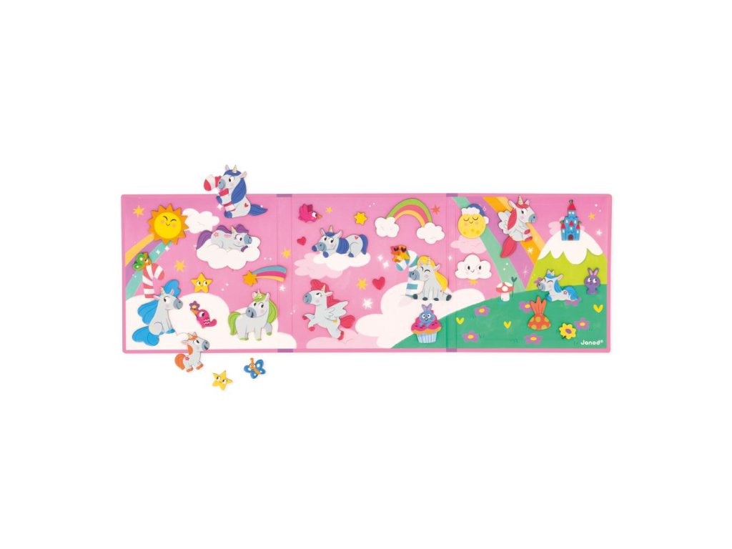 Rozkládací magnetická kniha Jednorožec pro děti od 3 let je vhodná pro cestování plné dobrodružných zážitků a příběhů, obsahuje 30 magnetických částí.