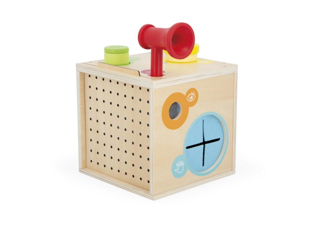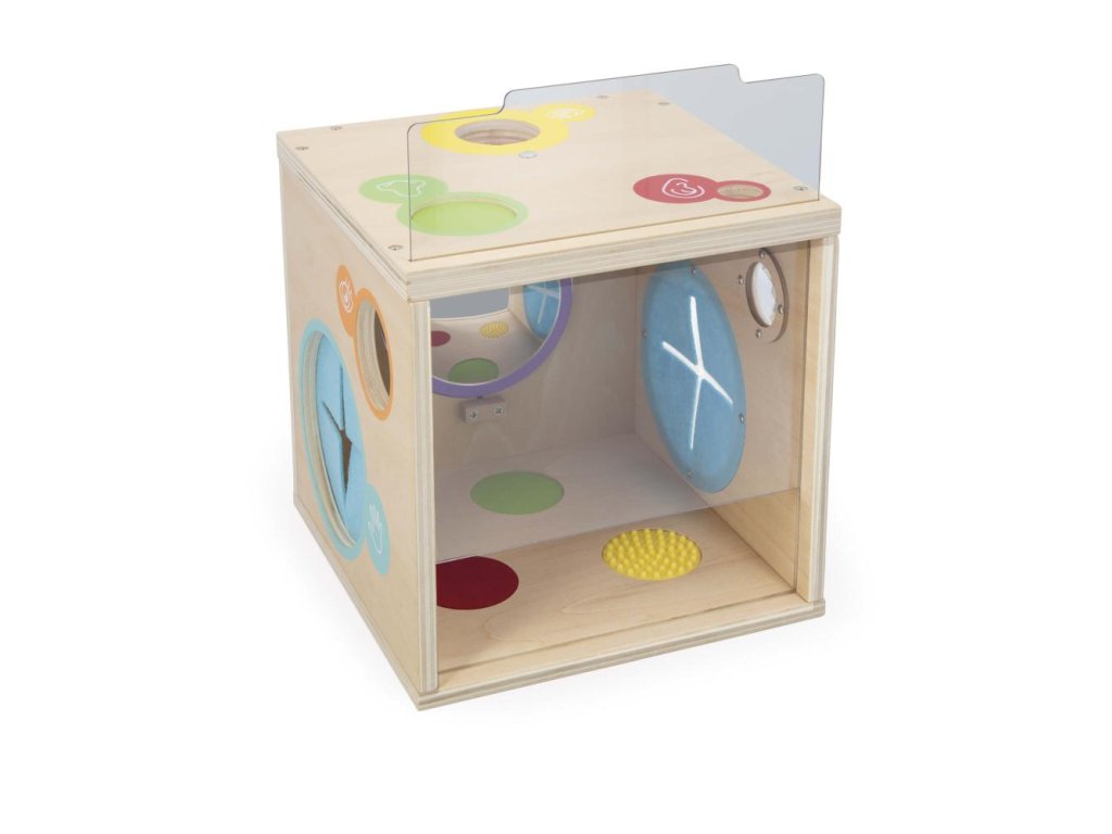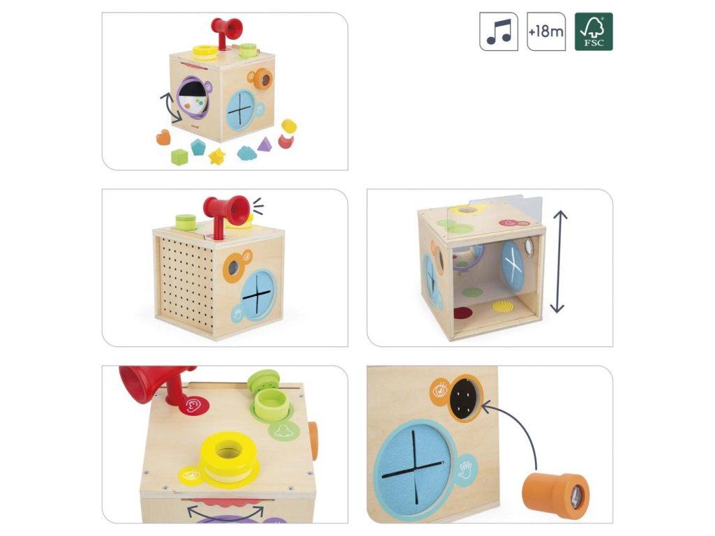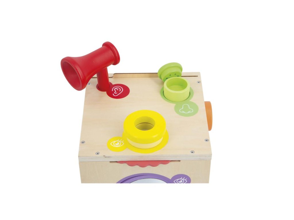 Objevování smyslů! Představujeme úžasnou smyslovou kostku, která pomáhá rozvíjet 4 z 5 smyslů (čich, sluch, hmat a zrak) pomocí zábavných aktivit, které můžete dělat se svým dítětem. Rozvíjejte jejich čich pomocí aromatických bylin. Zažijte zesilení hlasu s megafonem. Dotykem objevíte nové textury nebo rozpoznáte jednoduché tvary. Dívejte se na předměty a okolí přes kaleidoskopy nebo barevné filtry. Hrajte si s jasem a zrcadly. Čeká vás spousta zábavných hodin spojování se s vaším dítětem. Hračka na učení ze dřeva FSCTM. Pro rodiče a děti od 18 měsíců.