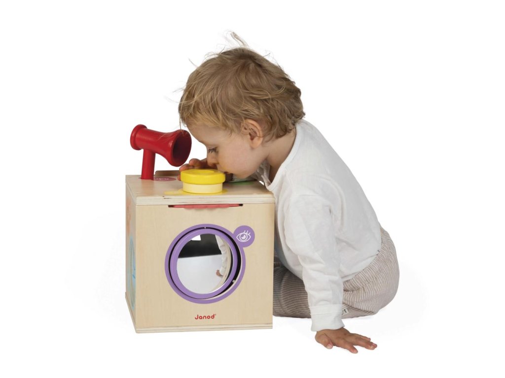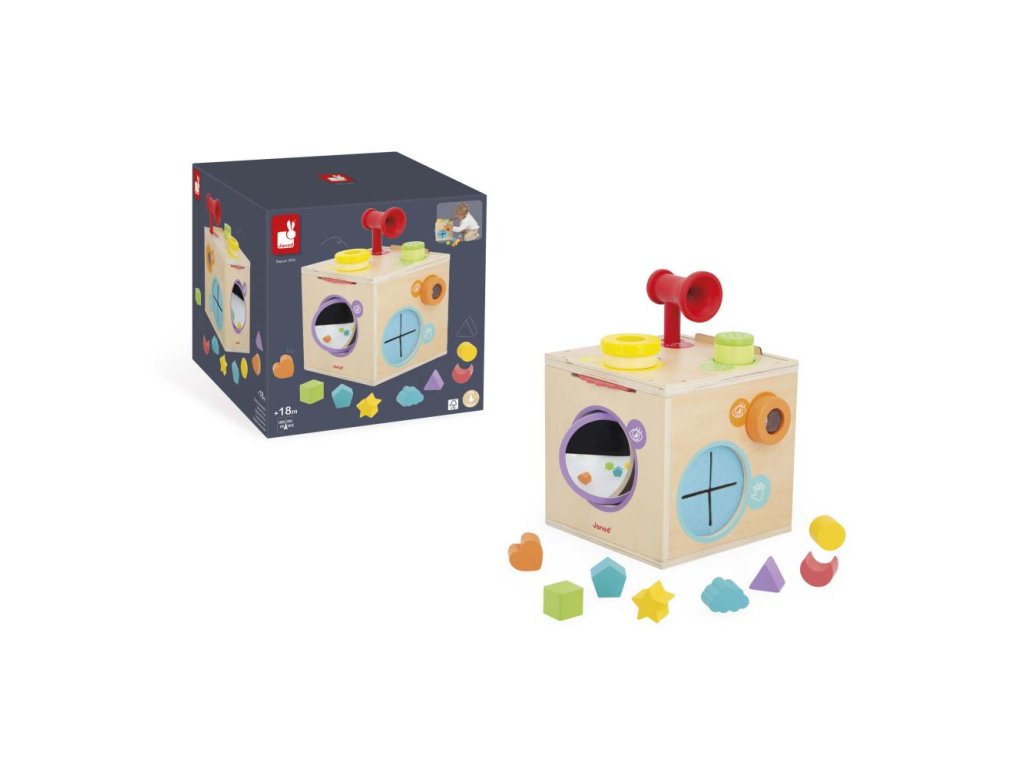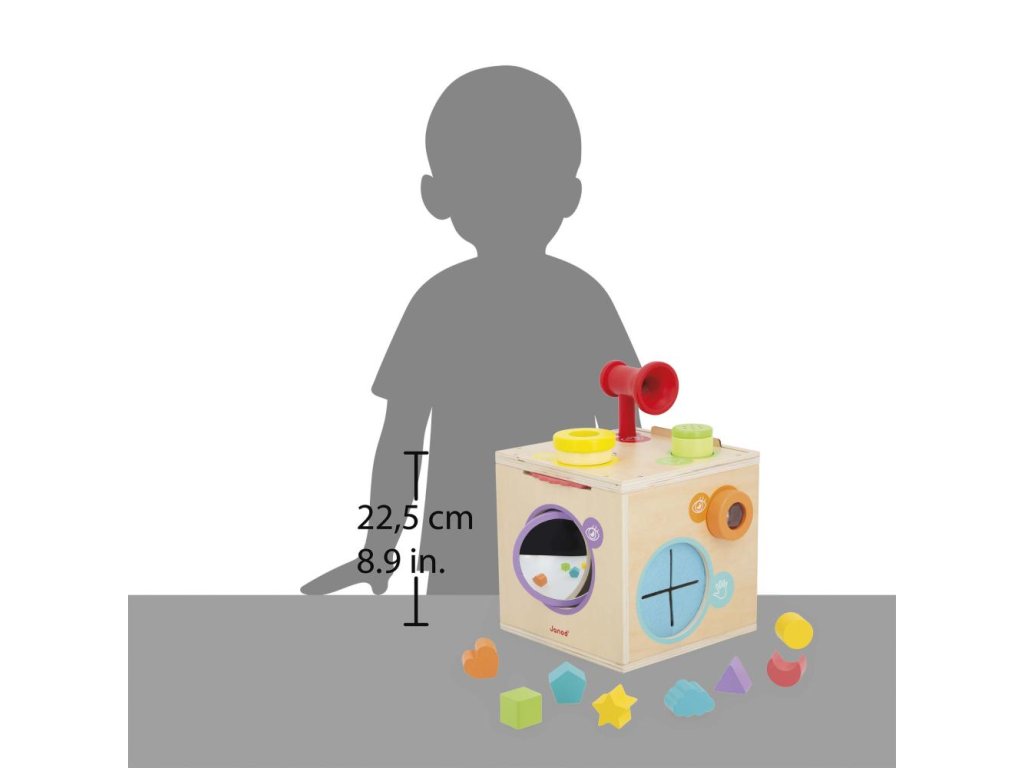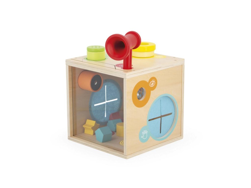 Objevování smyslů! Představujeme úžasnou smyslovou kostku, která pomáhá rozvíjet 4 z 5 smyslů (čich, sluch, hmat a zrak) pomocí zábavných aktivit, které můžete dělat se svým dítětem. Rozvíjejte jejich čich pomocí aromatických bylin. Zažijte zesilení hlasu s megafonem. Dotykem objevíte nové textury nebo rozpoznáte jednoduché tvary. Dívejte se na předměty a okolí přes kaleidoskopy nebo barevné filtry. Hrajte si s jasem a zrcadly. Čeká vás spousta zábavných hodin spojování se s vaším dítětem. Hračka na učení ze dřeva FSCTM. Pro rodiče a děti od 18 měsíců.