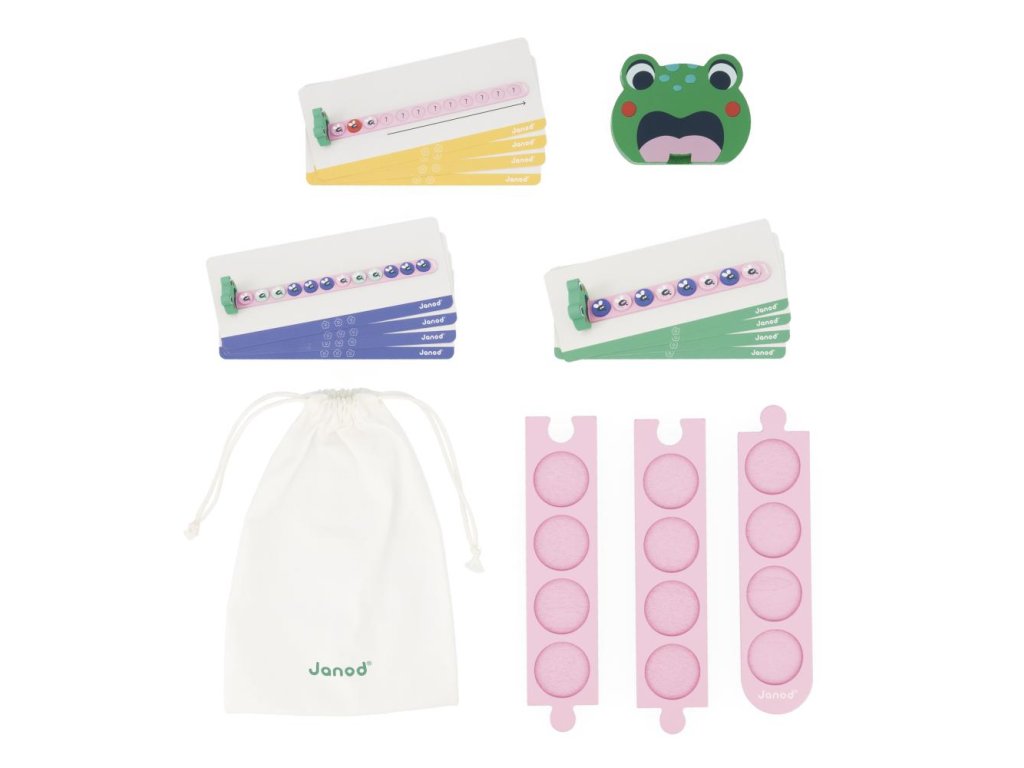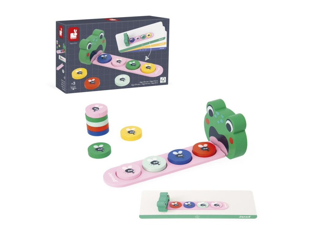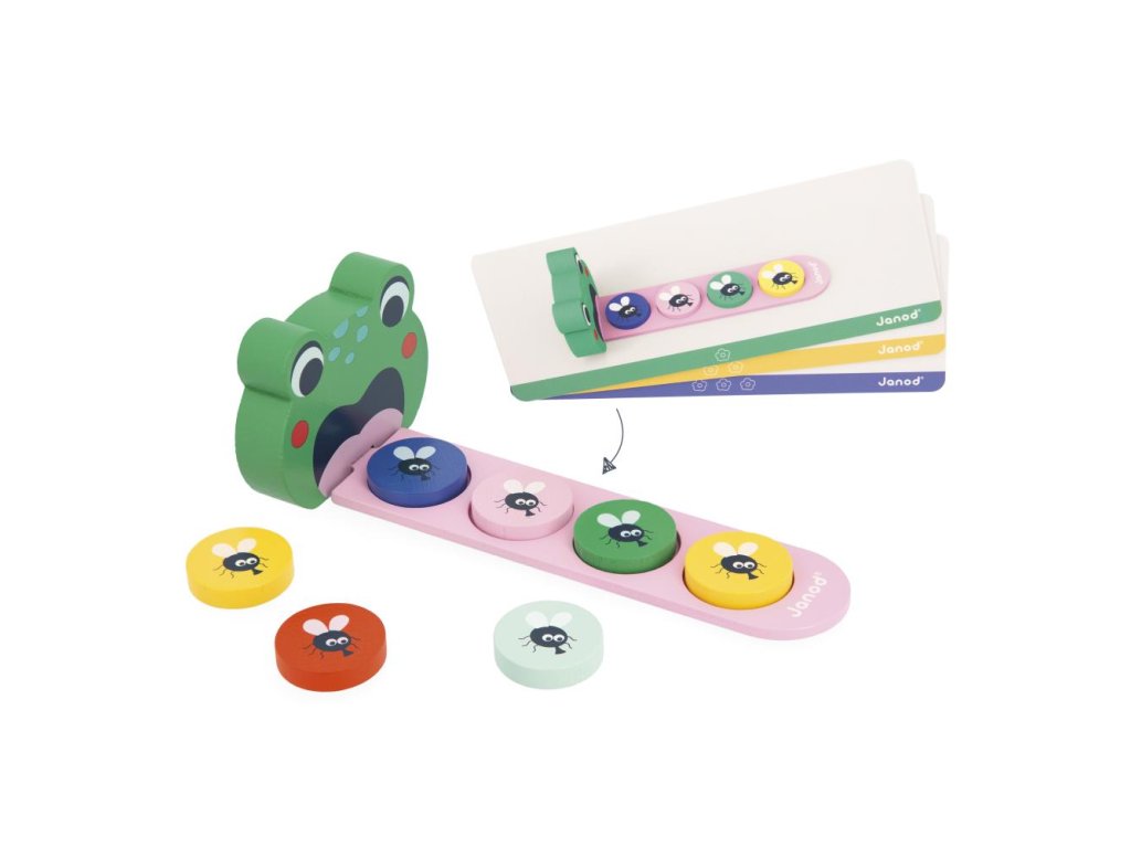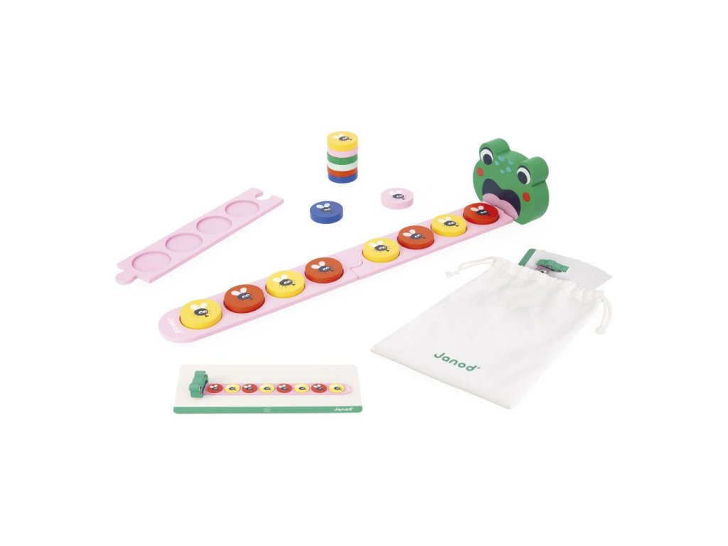 Pro chamtivou žábu Froggy je čas oběda. Ale pozor, důležité je dávat jí mušky na jazyk opatrně, abys pochutnala vždy na něčem jiném! Tato vzdělávací hra umožní vašemu dítěti naučit se rozlišovat barvy a identifikovat logickou posloupnost. Existují 2 způsoby hry: Prvním je samostatná hra, během které musí vaše dítě reprodukovat logickou posloupnost barev podle obrázků na kartičkách. Druhý režim je spolupráce s rodičem: pomáhá vašemu dítěti učit se o algoritmech a zároveň sdílet zábavné chvíle. Tato hra se skládá z dřevěné žáby, jazyka rozděleného na 3 do sebe zapadající části, 36 much na barevných žetonech a 12 předlohových karet. Umisťováním much na jazyk žáby se vaše dítě zábavnou formou naučí, jak reprodukovat a identifikovat logickou posloupnost barev. Hračka vyrobena ze dřeva FSCTM a lepenky.