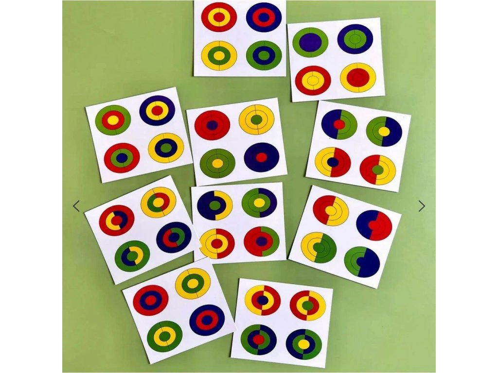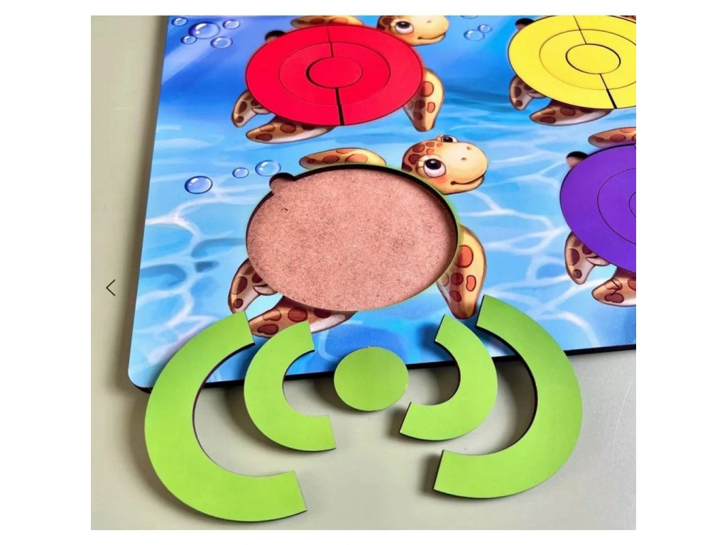 Dětská skládačka barevné půlkruhy a kolečka s motivem želviček. V sadě jsou i kartičky s předlohami. Zvládnete poskládat všem čtyřem želvičkám krunýře podle kartiček ? Děti procvičí jemnou motoriku, zrakové vnímání, barvy, samostatnou práci podle předlohy...