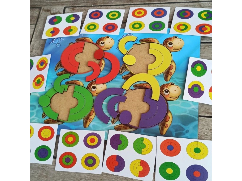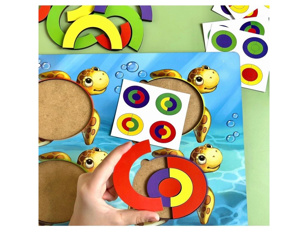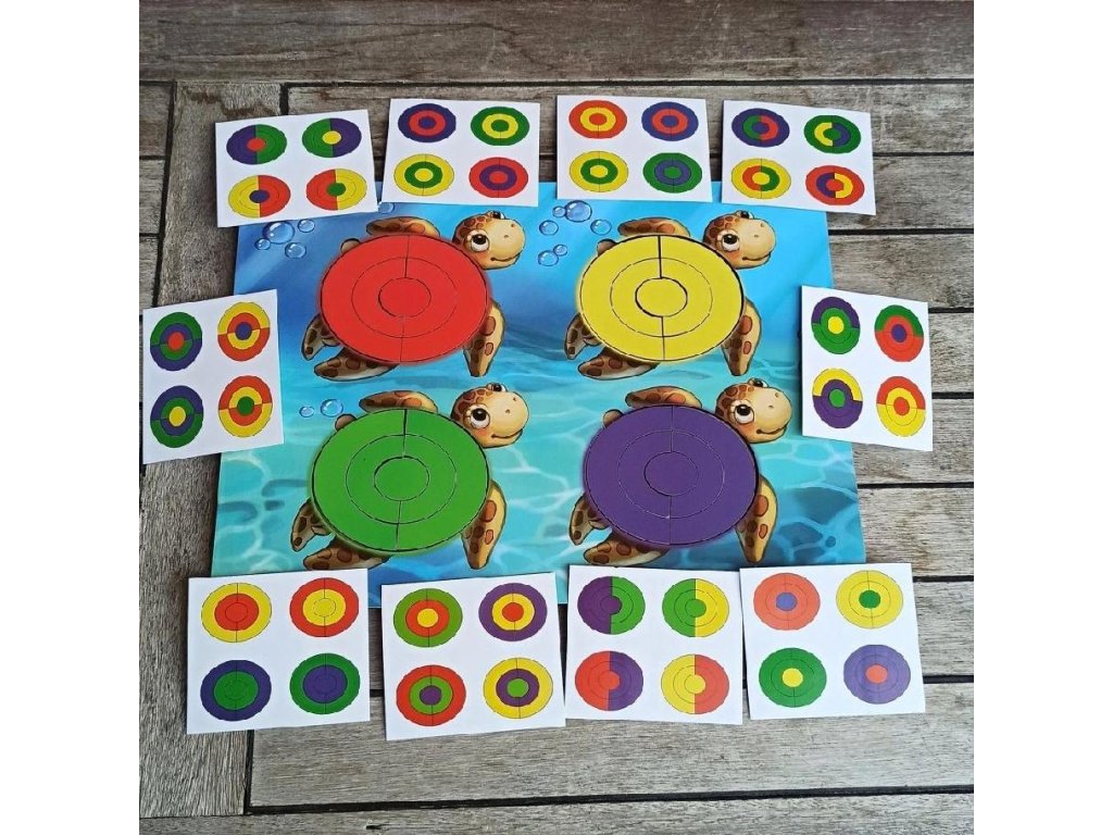 Dětská skládačka barevné půlkruhy a kolečka s motivem želviček. V sadě jsou i kartičky s předlohami. Poskládejte želvičkám krunýře podle předloh, nebo využijte dílky a skládejte dle fantazie...